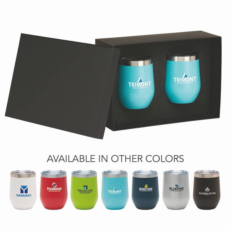 The Aria II Two-Piece Wine Tumbler Gift Set is a thoughtful gift for the wine lovers in your midst. This set can be shared and enjoyed with a friend as it includes two Aria tumblers. It comes in a classic medium-sized black gift box and each tumbler has a 12 oz. capacity and includes a protective, clear push-in lid. These double wall tumblers are perfect for the summer and winter with their vacuum insulation and copper lining which keep cold drinks cold for 12 hours and hot drinks hot for 8 hours. They have a beautiful powder-coated finish and are FDA compliant and BPA free. Complies with Prop 65. 11″ W x 4″ H x 7 11/16″ D