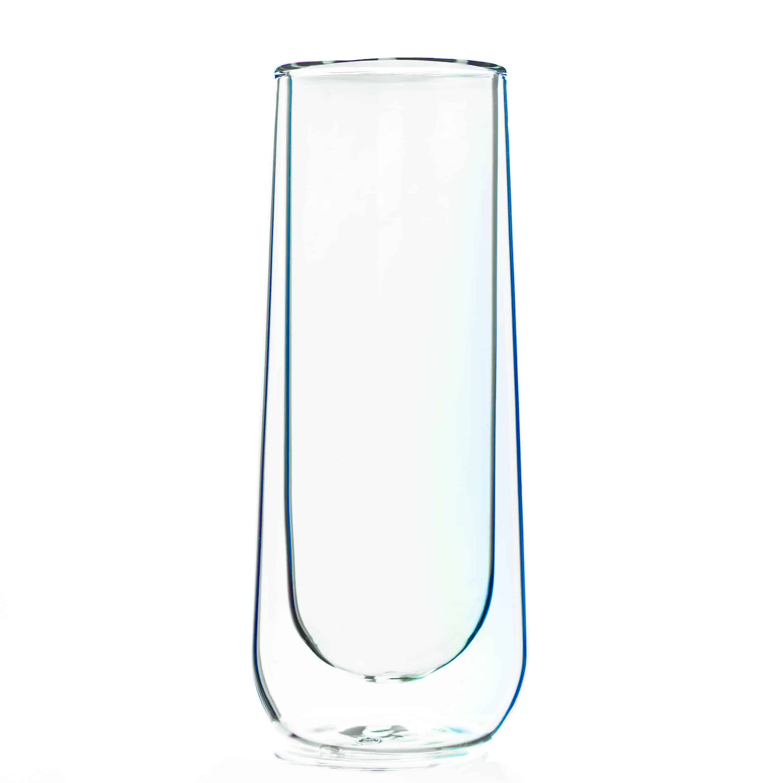Introducing Our New Asobu® Stemless Flute. The Asobu® Stemless Flute is made of durable and premium insulated double wall glass. Its double walled construction will help prevent condensation and sweat while keeping your drink cool and fresh. Its sleek design makes it the ideal Stemless Flute to bring in any special occasion. Complies with Prop 65. 2.4″ L x 2.4″ W x 6.02″ H