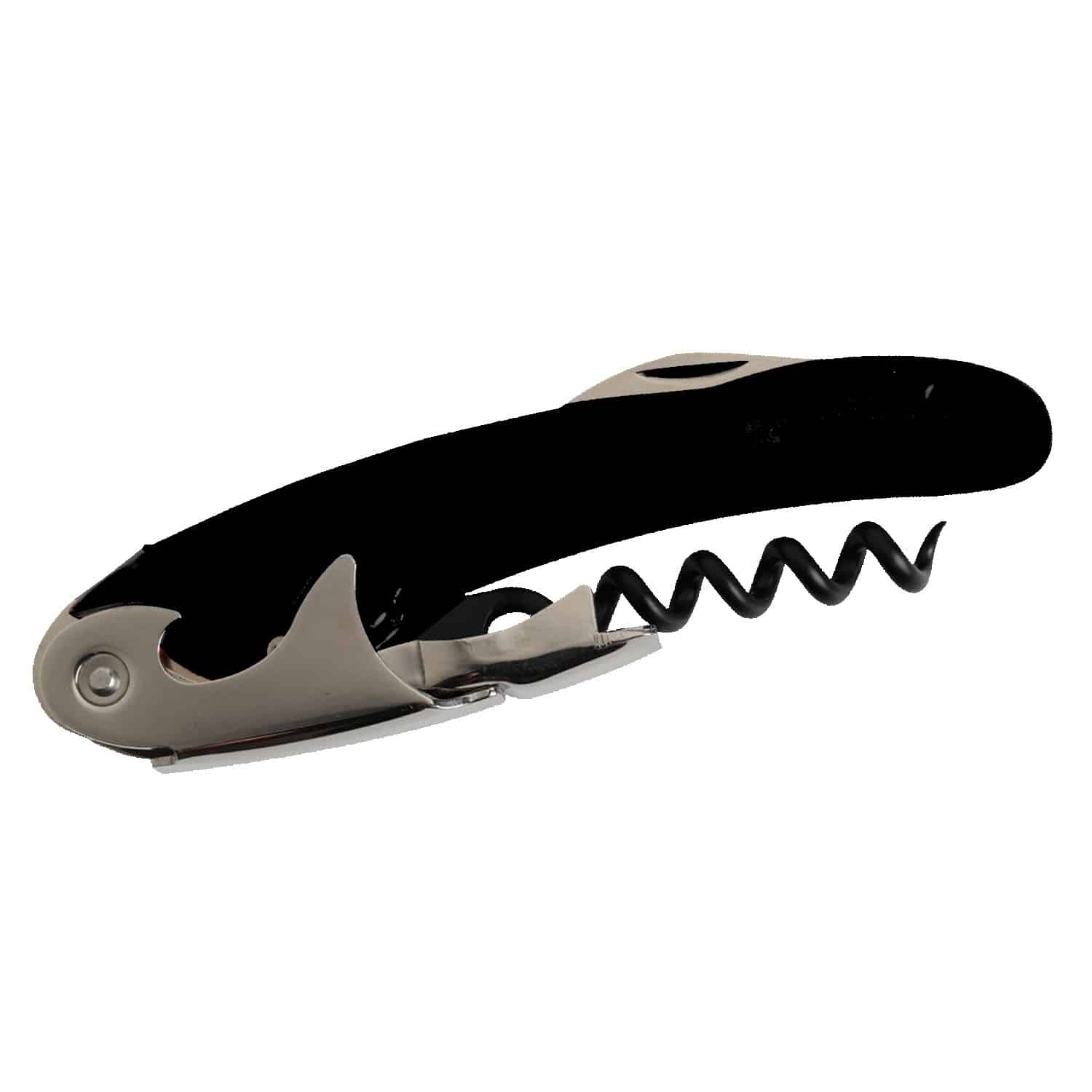 Easily open wine bottles with black, non-stick coated corkscrew and double hinge lever. Features foil cutter blade and soft rubber grip edges. 1 1/2″ W x 4 5/8″ H x 7/16″ D