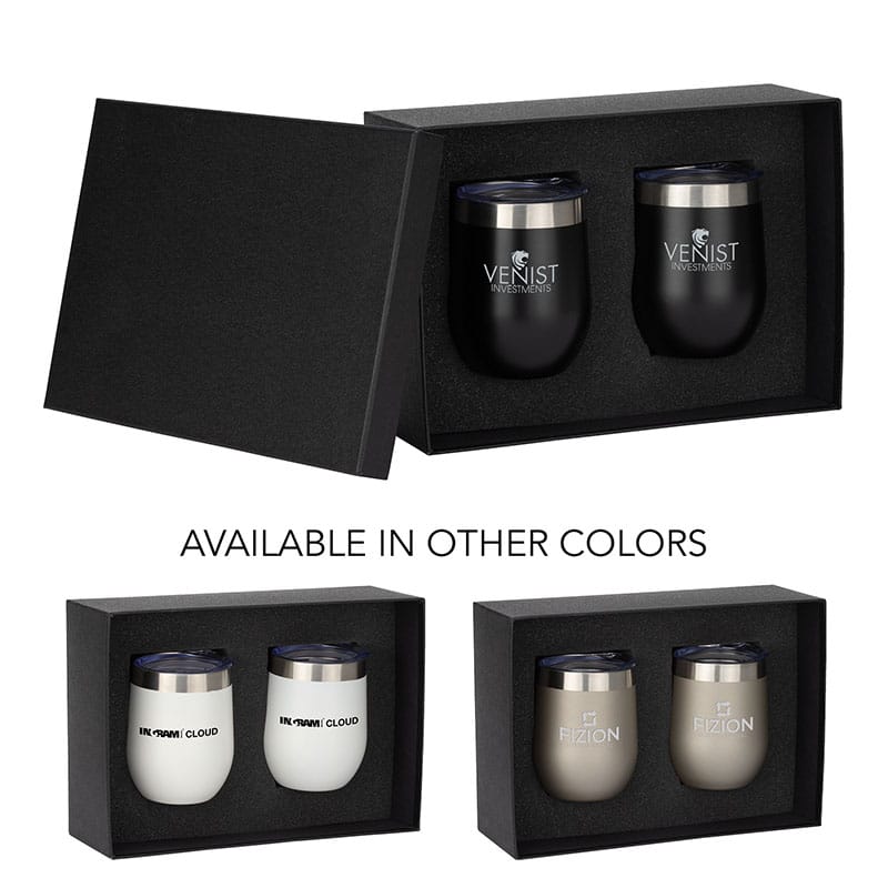 Gift the Brisbane II Two-Piece Classic Wine Tumbler Set to your customers or employees. This set includes 2 Brisbane wine tumblers with 12 oz. capacities each. With a double wall, copper lining and vacuum insulation, these tumblers will keep your hot drinks hot for 8 hours and your cold drinks cold for 12 hours. They are made with 304 stainless steel, have beautiful ergonomic designs and clear, push-in lids. Tumblers are FDA compliant and BPA free. Complies with Prop 65. 11″ W x 4″ H x 7 11/16″ D
