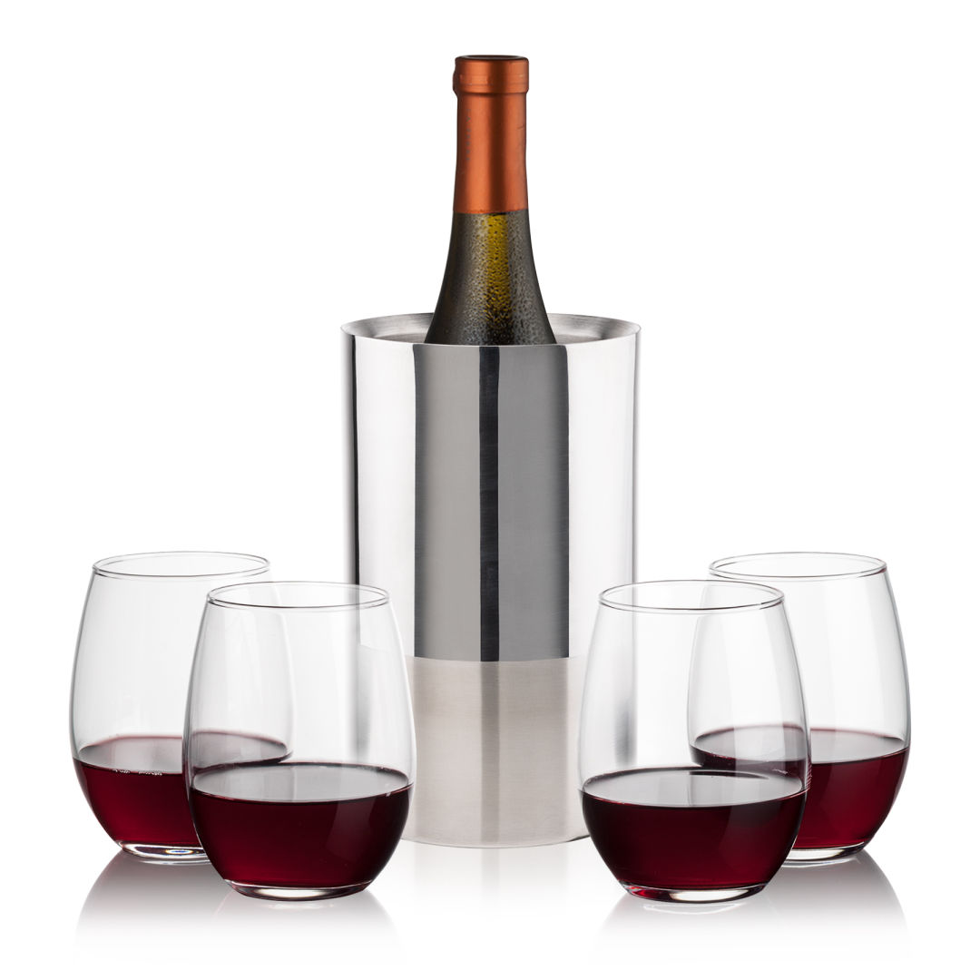 Elevate any pour with the Catania Wine Cooler & Wine Set, featuring a sleek, polished stainless steel cooler that keeps your favorite bottle perfectly chilled alongside elegant wine glasses for a refined table moment. The cooler’s modern silhouette delivers standout style from countertop to patio, while the crystal-clear glasses balance comfort and sophistication for reds, whites, or rosés. Available with a variety of stemmed and stemless wine glass options, this set makes an effortlessly versatile gift—or a timeless upgrade to your own barware.