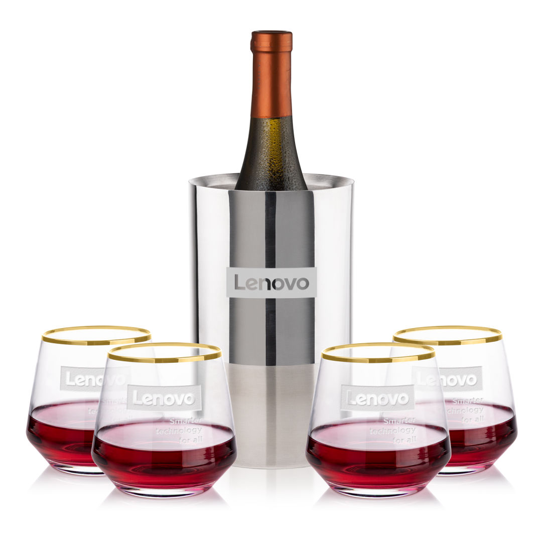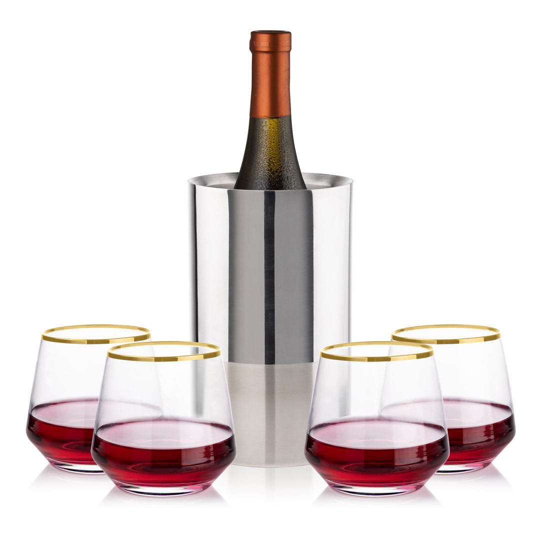 Elevate any pour with the Catania Wine Cooler & Wine Set, featuring a sleek, polished stainless steel cooler that keeps your favorite bottle perfectly chilled alongside elegant wine glasses for a refined table moment. The cooler’s modern silhouette delivers standout style from countertop to patio, while the crystal-clear glasses balance comfort and sophistication for reds, whites, or rosés. Available with a variety of stemmed and stemless wine glass options, this set makes an effortlessly versatile gift—or a timeless upgrade to your own barware.Capacity: Glass 13.5oz