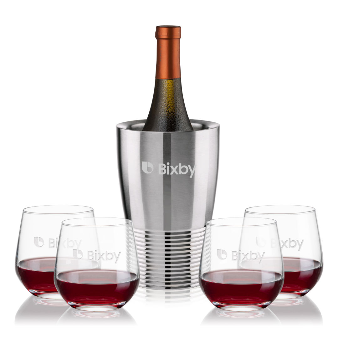 The Genoa Wine Cooler & Wine Glass Set brings a sleek, contemporary touch to any gathering. The stainless steel Genoa wine cooler keeps bottles perfectly chilled with its smooth, polished finish and modern ribbed design, while the crystal-clear wine glasses enhance every pour. Perfect for entertaining, gifting, or everyday enjoyment, this set combines style, quality, and functionality in one elegant presentation. Various wine glass styles are available.