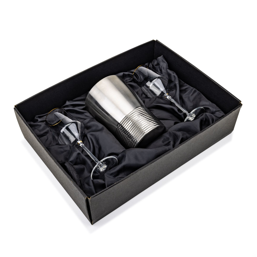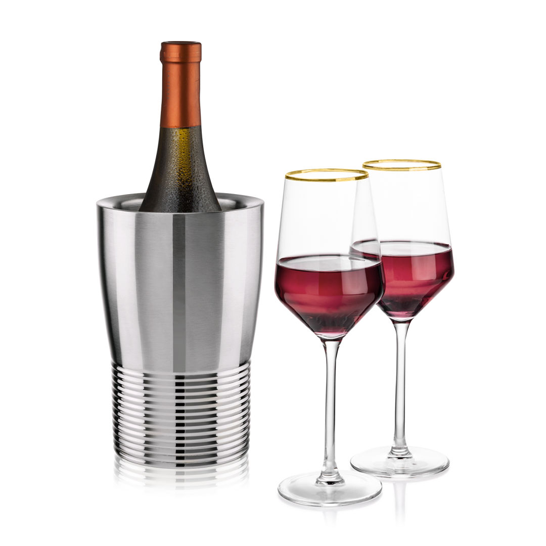 The Genoa Wine Cooler & Wine Glass Set brings a sleek, contemporary touch to any gathering. The stainless steel Genoa wine cooler keeps bottles perfectly chilled with its smooth, polished finish and modern ribbed design, while the crystal-clear wine glasses enhance every pour. Perfect for entertaining, gifting, or everyday enjoyment, this set combines style, quality, and functionality in one elegant presentation. Various wine glass styles are available.