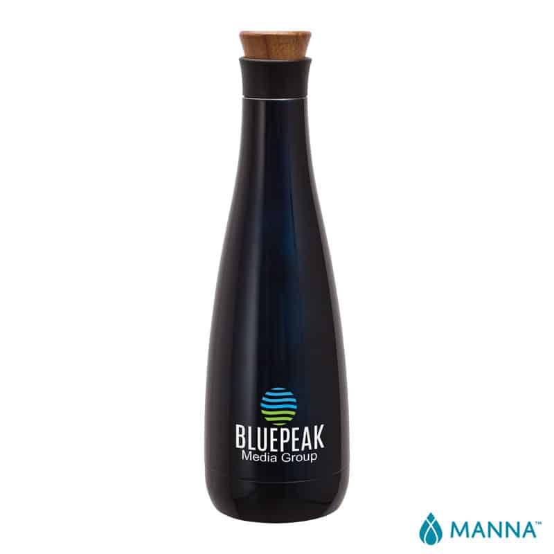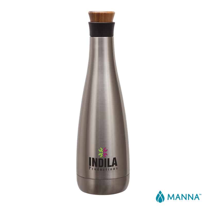 The 25 oz. Carafe steel bottle from Manna is beautiful in its minimalist design. It features a two piece lid for 2 opening sizes; the acacia wood pour spout lid fits into a bottom piece made of polypropylene. This carafe makes a fashionable statement to clients who may be looking to drink a little more than just water. Its 25 oz. capacity holds one bottle of wine or your beverage of choice. Its 18/8 double wall stainless steel and vacuum insulated construction keeps beverages cold for 24 hours and hot for 12. BPA free. Complies with Prop 65. 3 1/2″ W x 11 3/4″ H x 3 1/2″ D