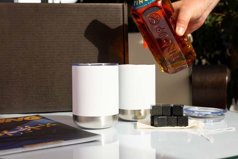 The Mt Bradley on the Rocks Gift Set offers a premium drinking experience. It includes two 15 oz Basecamp stainless steel double-wall vacuum tumblers with slider lids, perfect for keeping drinks at the ideal temperature. Nine laser-etched whiskey stones come in a muslin bag, ready to chill your drink without dilution. The set is packaged in a custom gift box with crinkle paper, featuring a roll-end tuck front and an imprinted spectrum label for a stylish and easy-to-open presentation.