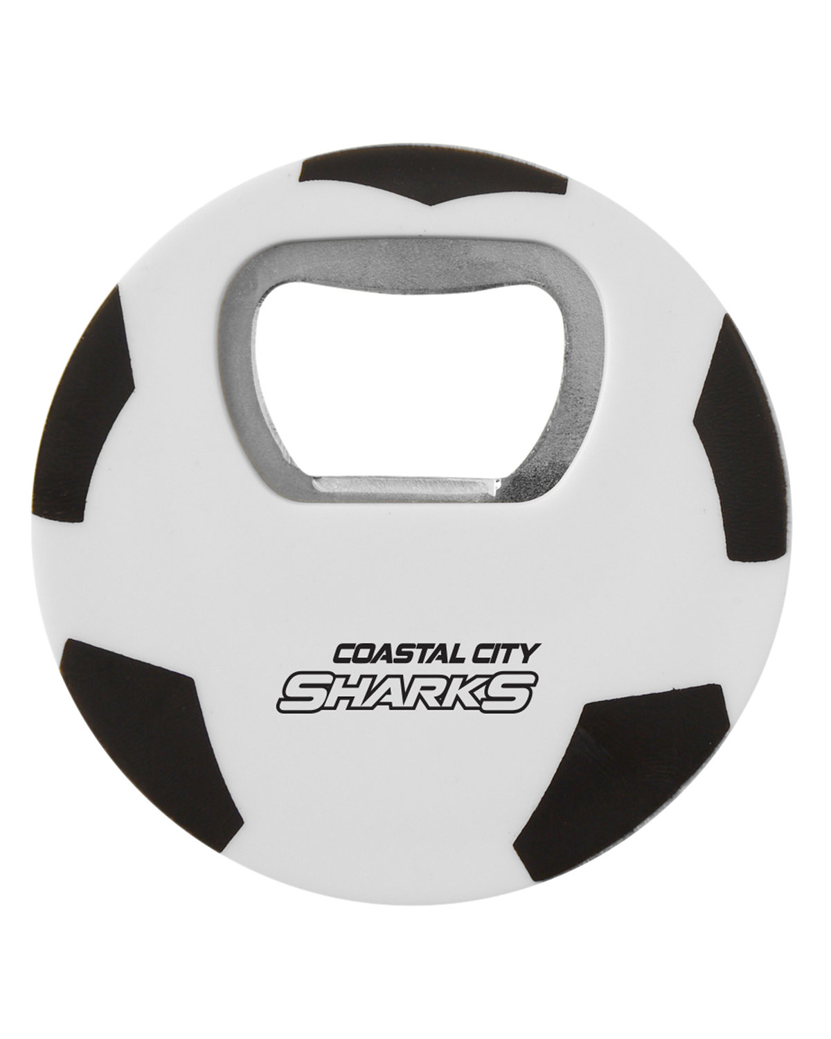 Soccer ball sports ball-shaped bottle opener. Features soccer ball stock art on both sides. Made of durable ABS Plastic with stainless opener insert. Features heavy duty magnet on back to store on refrigerator and other metal items. Designed for opening bottles and flip-top cans.