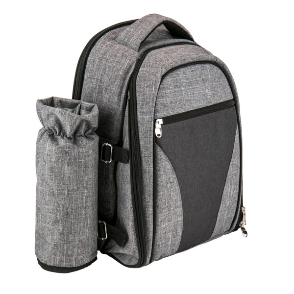Four-person picnic backpack makes meals on the go a breeze! Includes: (4) plastic plates, (4) cloth napkins, (4) plastic wine glasses, (4) metal/plastic sets of utensils, salt and pepper shakers, cutting board, bottle opener, cheese knife and fleece blanket. Packaged in black menswear-patterned backpack with insulated wine pocket and insulated cooler compartment. 8″ D x 15.75″ H x 19″ W