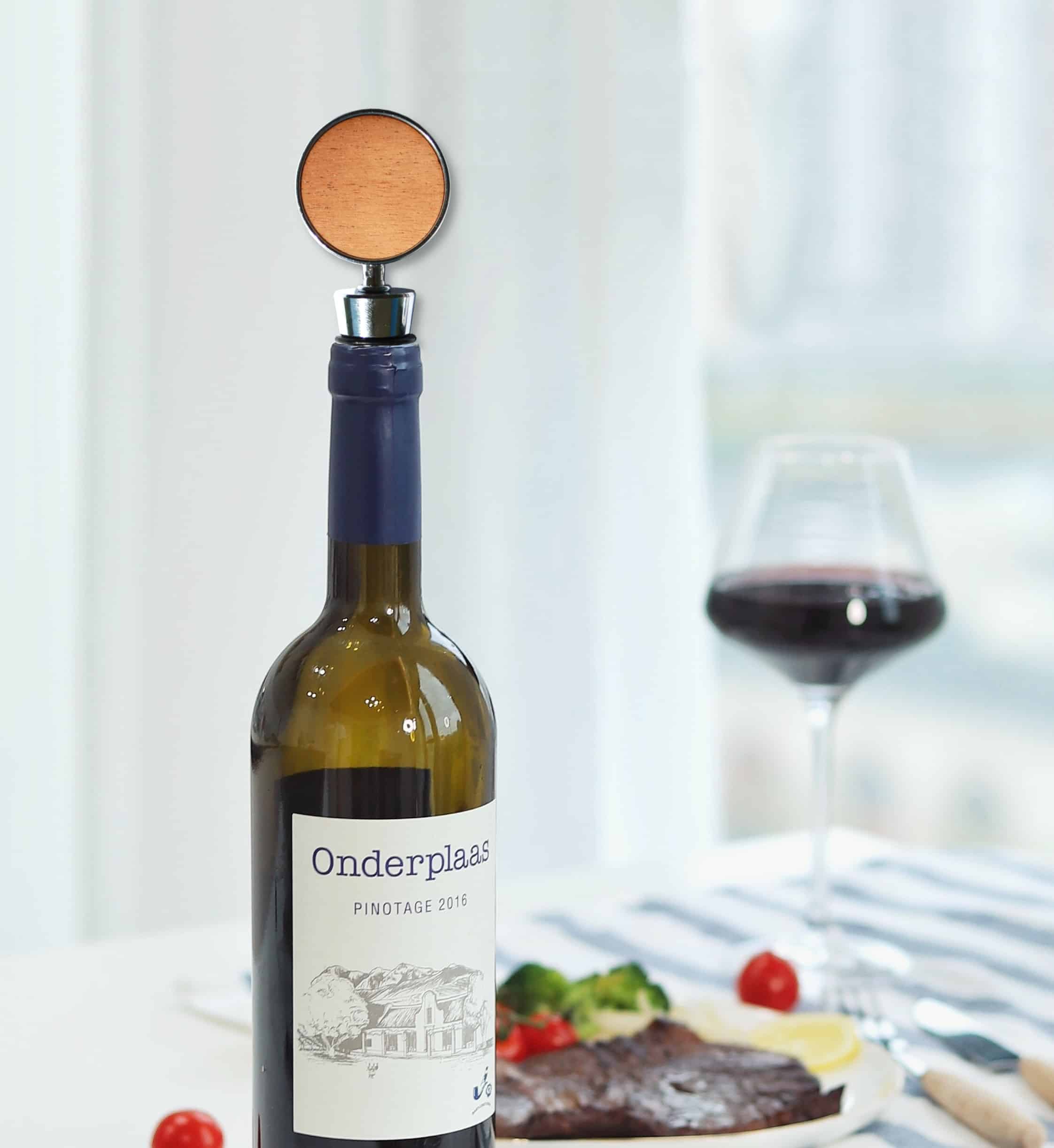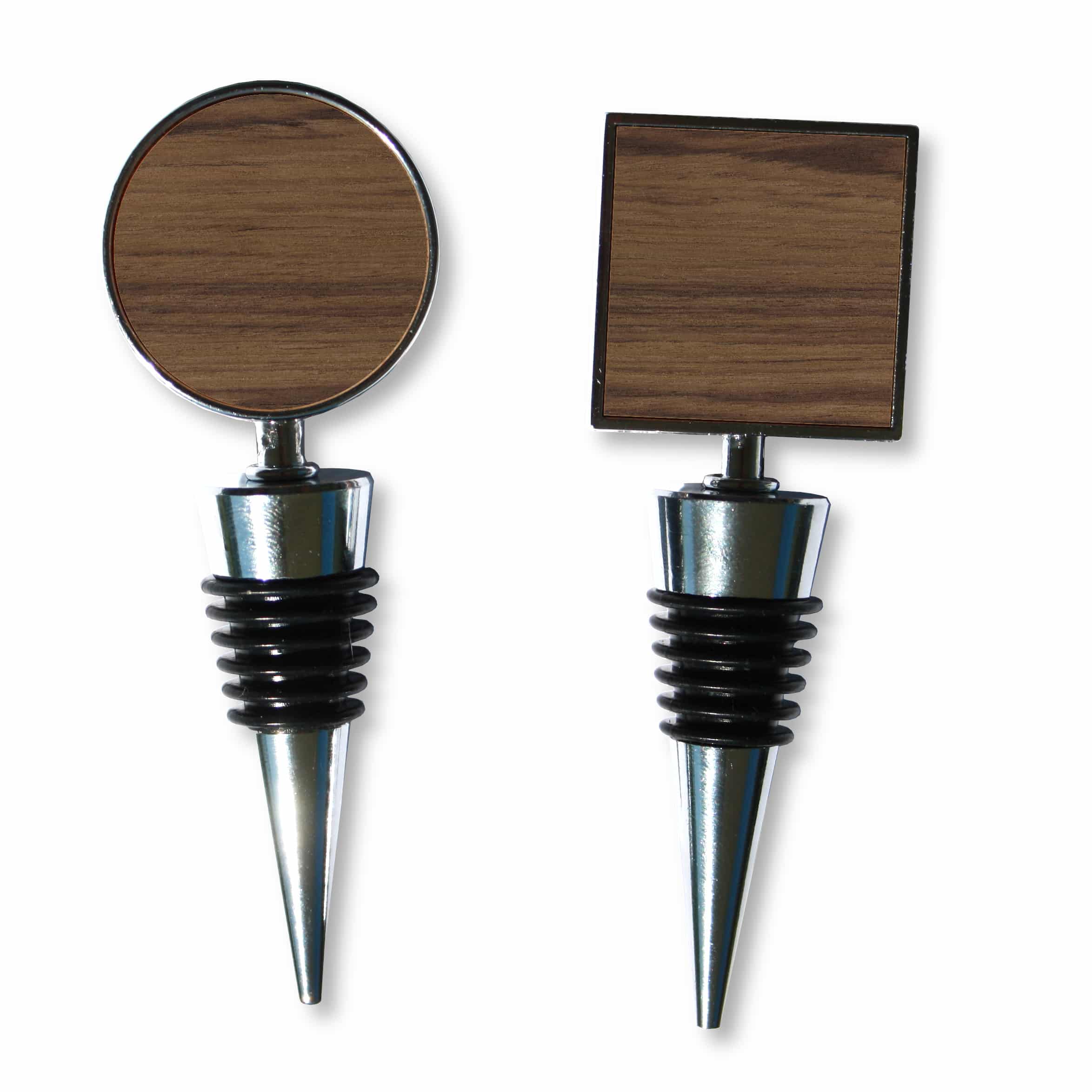 Wooden Wine Bottle Stopper (Cone Style) – Classic steel, cone style with round, or square top-shape with laser engraved wood on both sides. Multiple head shapes available. Solid and satisfyingly heavy. Individual personalization available; see customization options. Handcrafted in Hidden Springs, Idaho, USA. Complies with Prop 65. 4″ W x 2″ H x 0.5″ Thick